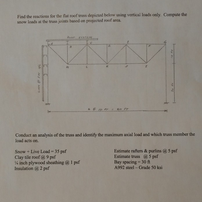 2 what type of load is acting on the roof truss shown in the figure roof self weight snow or wind. The roof is simply supported on purlins which in turn are attached to the joints at the top chord of the truss. Use the method of joints for both numbers to determine the force in each member of the roof truss shown. The roofing panels span between purlins see loads and load paths lab notes which carry the roof loads to the truss joints.